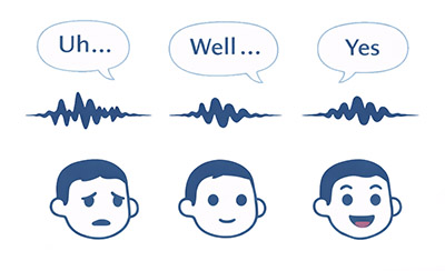 Smooth conversation depends on knowing whose turn it is to speak. The project modelled creaky voice — the subtle low rattle heard at the end of utterances — and smiling voice, the audible warmth that enters speech when we grin. Creaky voice turned out to be a powerful turn-yielding cue: when added to the end of an utterance, listeners instinctively understood the speaker was done, dramatically reducing unwanted interruptions. A synthesised smile in the voice similarly changes how the spoken content is perceived, opening the door to more empathetic systems. Together, fillers, pitch, speech rate, and voice quality form a rich expressive palette — the very same words can sound confident or hesitant, warm or detached, depending entirely on how they are delivered.