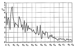 The decay times for the notes on a small upright piano are plotted in Fig. 11. As can be seen, the decay times vary drastically among the notes. In order to judge the perceptual consequences of the irregular curve we may compare two neighbouring notes, F#4 and G4. From the graph, we obtain the corresponding T20-values as 3.5 and 0.7 s, respectively. This large difference in decay time (5:1) suggests an aggravating difference in sustain between these two adjacent notes.